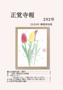 寺報 2026.03.05 2026年 春彼岸法座 正覚寺報を発送しました 3月の春彼岸法座のご案内を載せた正覚寺報を発送いたしました。どうぞご家族皆様でお読みくださいませ。 寺報に掲載した一法句(法話)はこちらから読めます。 春彼岸法座の日程等 2026年 春彼岸法座の詳細が決まりました